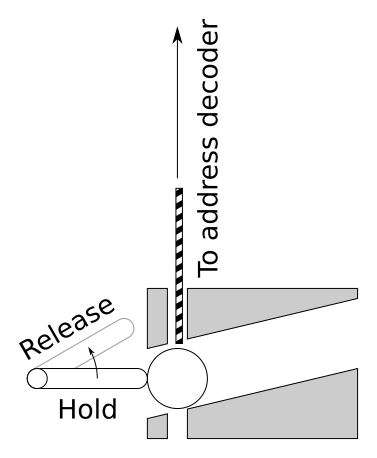 If, before releasing the holdoff bar, the rightmost vertical bar is moved upwards by a short distance, then word line 0 will be blocked at word line 1 will be free to move left, hence selecting memory address 1. If the second rightmost vertical bar is moved instead, address 2 will be selected; if both the two rightmost bars are both moved up, then address 3 is selected, and so on; all combinations of 4 bits select exactly one horizontal memory bar.